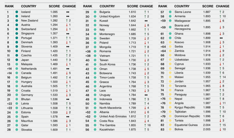 Исланд останува најмирната земја во светот, пред Ирска, Австрија, Нов Зеланд и Швајцарија. Најмирниот регион останува Западна и Централна Европа, додека Блискиот Исток и Северна Африка (МЕНА) остануваат најнестабилни. Западна и Централна Европа, останува најмирниот регион во светот, но забележа намалување на мирот од 0,57 проценти во последната година. Главната причина за влошувањето во регионот, според извештајот, е зголемената милитаризација, односно растот на воените буџети и инвестициите во одбраната по почетокот на војната во Украина.