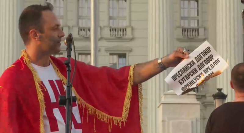 Протестот го отвори пејачот Ламбе Алабаковски со македонската химна порачувајќи: „Ако мојата дијагноза е пироман, вашата дијагноза е предавничка“. Алабаковски, кој беше обвинет за палењето на вратата на бугарскиот клуб „Ванчо Михајлов“ во Битола, симболично запали хартија на која пишуваше „Преспански договор, бугарски договор, француски предлог, фашизам“.