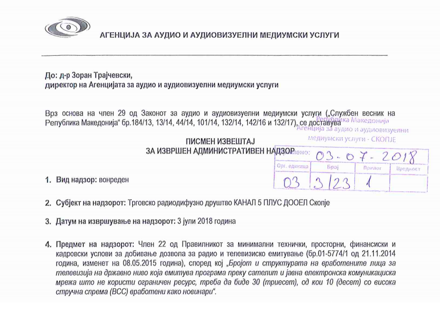 Во „Канал5+“ бил вработен само директорот – Агенцијата за медиуми предложи да ѝ биде одземена дозволата