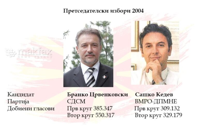 На третите претседателски избори во 2004 година за претседател во вториот круг беше избран Бранко Црвенковски од СДСМ. Во првиот круг тој освои 385.347 гласа, односно 42,5 отсто, а во вториот круг доби 550.317 гласа или 62,6 отсто. Негов противкандидат во вториот круг беше Сашко Кедев од ВМРО-ДПМНЕ, кој во првиот круг доби со 309.132 гласа, односно 34,1, а во вториот круг за него гласаа 329.179 граѓани, односно 37,4 отсто.