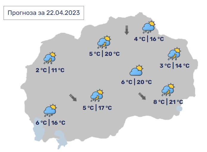 Ио Скопје, претпладне се очекува сончево време со мала до умерена облачност, а попладне со краткотраен пороен дожд и ретки грмежи. Ќе дува слаб до умерен ветер од северен правец.