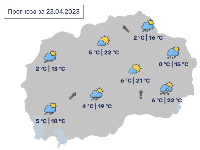 Времето денес ќе биде сончево со мала до умерена облачност. Попладне на места ќе има услови за краткотраен дожд и ретки грмежи. Ќе дува слаб до умерен ветер од јужен правец, се вели во прогнозата на Управата за хидрометеоролошки работи (УХМР).