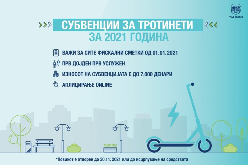 Граѓаните ќе можат да доставуваат фискални сметки за купен велосипед или електричен тротинет од почетокот на годинава, поточно од 1 јануари 2021 година. Средствата што Градот Скопје ќе ги субвенционира се во износ од 50% од вредноста на велосипедот, но не повеќе од 3.000 денари по лице, и 30% од вредноста на електричниот тротинет, но не повеќе од 7.000 денари по лице, со вклучен персонален данок на доход. Повикот ќе биде отворен до исцрпување на средствата, а ќе се спроведува по принципот „прв дојден – прв услужен“.