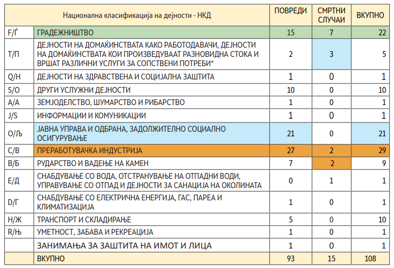 Според извештајот, во 2023 година најмногу несреќи има во Преработувачката индустрија 29, по што следи Градежништвото и Јавна управа и одбрана 22. Најголем број на несреќи кои резултирале во смрт има во дејностите на градежништвото 7, дејностите на домаќинства како работодавачи 3 и преработувачка индустрија и рударство по 2.