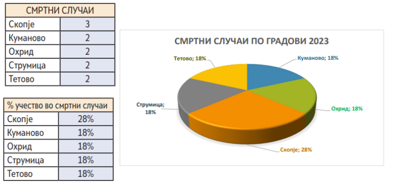 Во однос на градот во кој се случила несреќата, Скопје е град со најголем број на несреќи. По Скопје следат Битола и Прилеп.