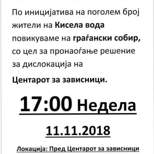 По иницијатива на поголем број на граѓани кои жиевеат во општина Кислеа Вода денеска ќе се одржи граѓански собир на кој жителите ќе бараат решение за дислокација на Центарот за зависници.