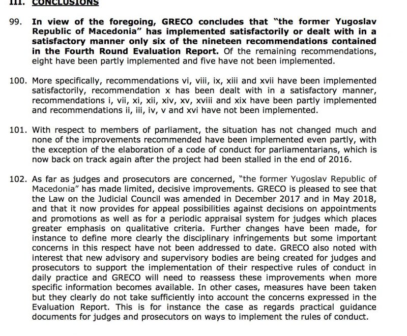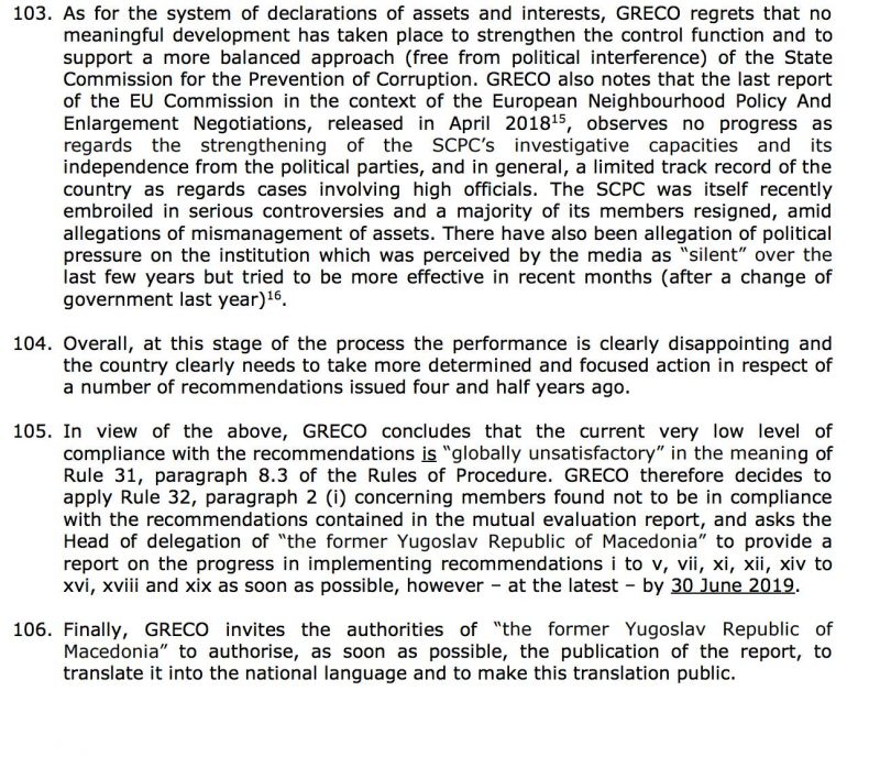 Оценувајќи дека работата на полето на антикрупцијата е „јасно разочарувачка”, ГРЕКО ги повикувува властите да преземат порешителна и фокусирана активност во однос на бројот на препораките објавени пред 4,5 години.