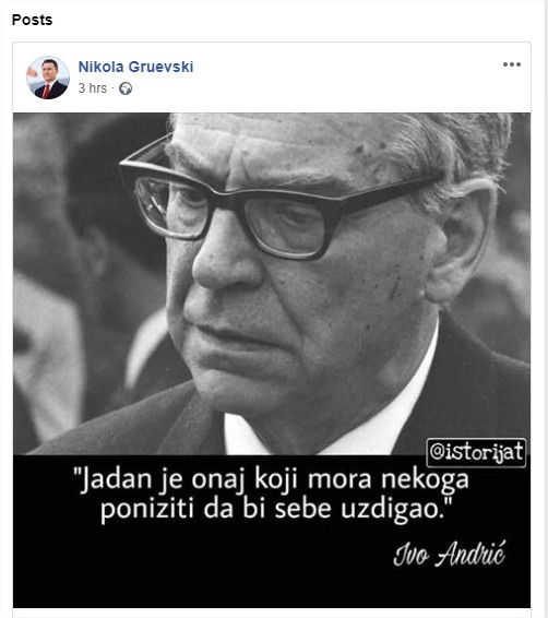 Експремиерот Никола Груевски на социјалните мрежи сподели цитат од југословенскиот писател и добитник на Нобеловата награда за литература Иво Андриќ.