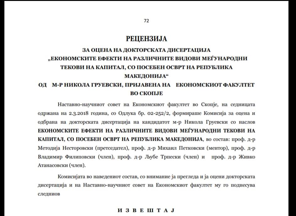 Комисијата професори во состав: Методија Несторовски, Михаил Петковски, Владимир Филиповски, Љубе Трпески и Живко Атанасовски дала позитивно мислење за докторатот. Според Билтенот објавен на УКИМ, докторатот содржи 315 страници текст, поделени во 7 поглавја. Ментор на Груевски му е професорот Михаил Петковски.