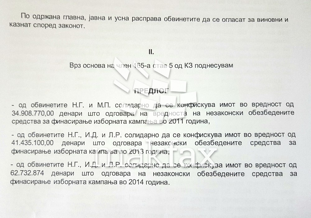 Никола Груевски сторил кривично дело „злосторничко здружување“ и продолжено кривично дело “злоупотреба од средствата на изборната кампања и повреда на избирачкото право“. На Мартин Протоѓер му се става на товар и кривичното дело „повреда на слободата на определување на гласачите“, а Миле Јанакиески, покрај другите кривични дела, ќе одговара и за уништување изборен материјал. Пратеникот Илија Димовски, како и Никола Груевски се товарат за злосторничко здружување и продолжено кривично дело „злоупотреба од средствата на изборната кампања“. СЈО за Груевски, Протоѓер, како и за Кирил Божиновски, Миле Јанакиески и Гордана Јанкуловска, побара мерка притвор, но Апелациониот суд одлучи само да им ги одземе пасошите и да донесе решение со кое тие еднаш неделно треба да се јавуваат во судот кај шалтерски службеник.