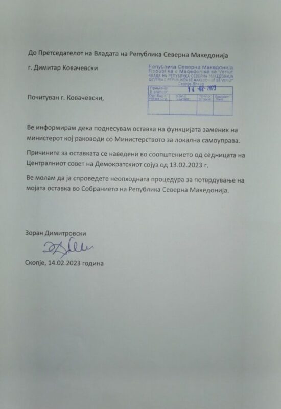 Генералниот секретар на Демократскиот сојуз, Зоран Димитровски, денеска до претседателот на Владата Димитар Ковачевски поднесе оставка на функцијата заменик-министер за локална самоуправа.