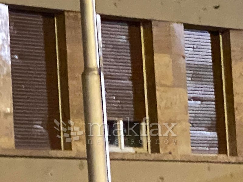 Фрлаат со факли, петарди, камења, шишиња и други предмети кон зградата. Како што може да се види, искршени се прозорци и оштетена е фасадата на Собранието.
