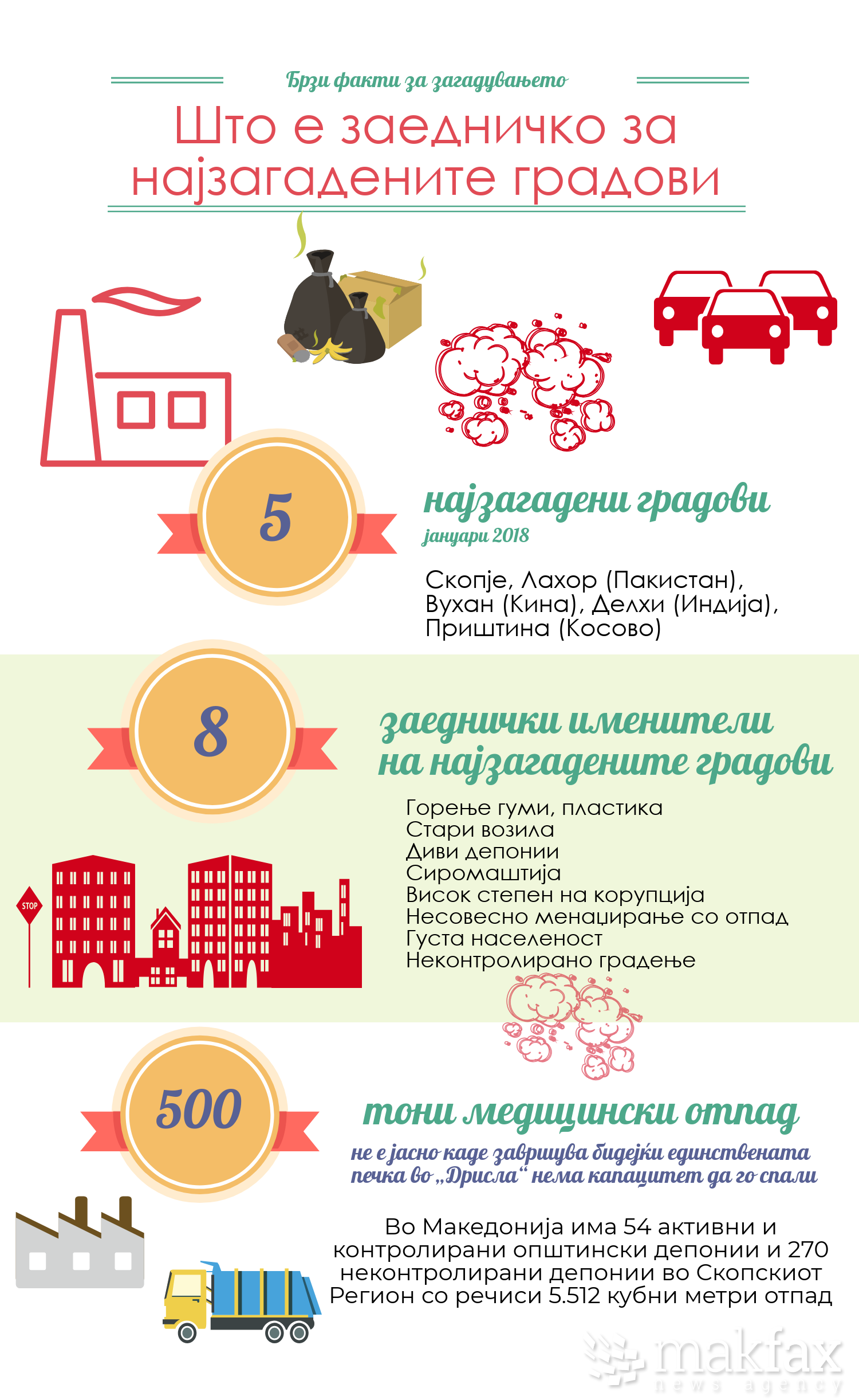 Анализата на „Макфакс“ покажува дека заеднички причинители за загадувањето во овие градови се чадот што се крева од горењето сè и сешто за затоплување на домовите што немаат пари за посоодветно и еколошко затоплување. Но, светските еколошки организации посочуваат дека ниската свест на населението и несовесното раководење со отпадот од надлежните институции во државите се исто така голем причинител за загадувањето. Дивите депонии во кои неселективно и несоодветно се гори секаков отад имаат најпоразително влијание врз квалитетот на воздухот.