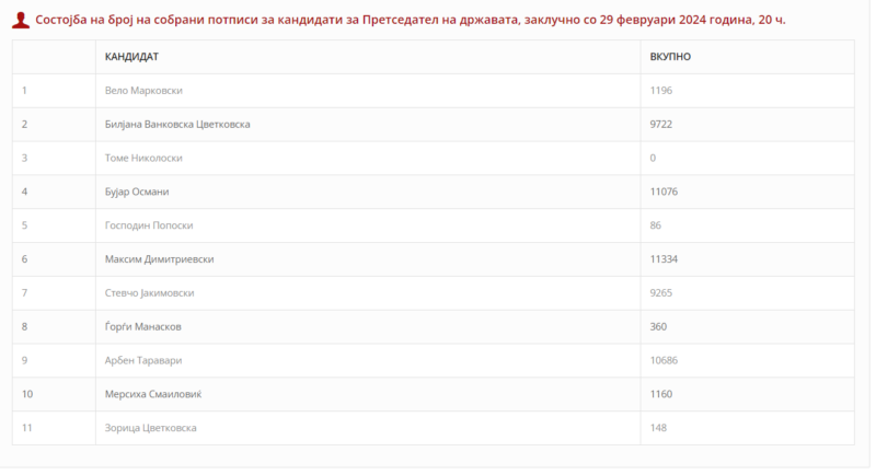 Досега Бујар Османи, Арбен Таравари и Максим Димитриевски успеаја да соберат 10.000 потписи и со тоа да бидат кандидати за претседател на државата.