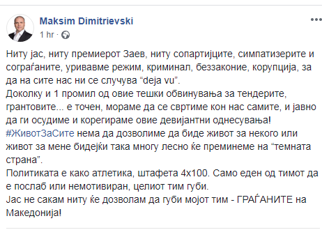 ‘Живот за сите’ нема да дозволиме да биде живот за некого или живот за мене бидејќи така многу лесно ќе преминеме на ‘темната страна’. Политиката е како атлетика, штафета 4х100. Само еден од тимот да е послаб или немотивиран, целиот тим губи. Јас не сакам ниту ќе дозволам да губи мојот тим – граѓаните на Македонија“, напиша Димитриевски.