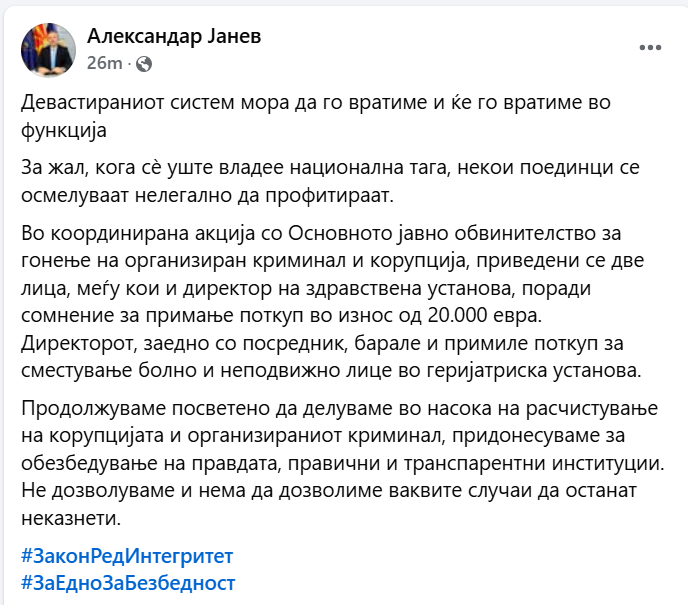 Директорот на Бирото за јавна безбедност, Александар Јанев, откривајќи детали за акцијата на МВР со Основното јавно обвинителство за гонење на организиран криминал и корупција, соопшти дека поткупот бил во износ од 20.000 евра.
