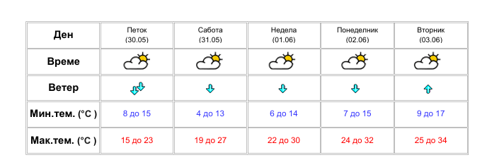 Променливо облачно време со локални врнежи од дожд кои повремено ќе бидат пообилни. Процесите ќе бидат поинтензивни во форма на невреме со пообилен пороен дожд (над 30 l/m² за 24 часа), засилен ветер и појава на грмежи. Ќе дува умерен до засилен ветер од јужен, а долж Повардарието од југоисточен правец. Минималната температура ќе биде во интервал од 6 до 12, а максималната ќе достигне од 12 до 17 степени.