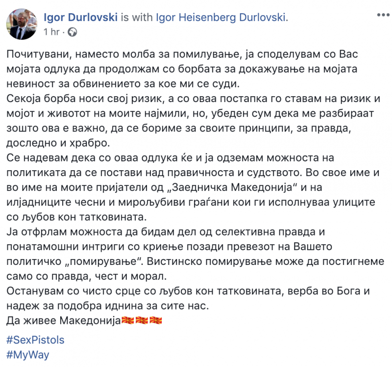,,Почитувани, наместо молба за помилување, ја споделувам со вас мојата одлука да продолжам со борбата за докажување на мојата невиност за обвинението за кое ми се суди.