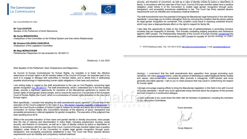 Во писмото упатено до македонскиот парламент, a објавено денеска, комесарката за човекови права на Советот на Европа, Дуња Мијатовиќ, силно ги охрабрува тековните напори за усогласување на македонската правна рамка со стандардите на Советот на Европа во областа на правното признавање на родот за трансродовите (транс) луѓе.