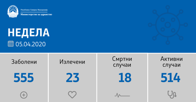 Со ова, вкупната бројка на дијагностицирани пациенти со КОВИД-19 денеска изнесува 555 лица.
