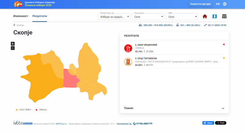 Според податоците објавени на страната на Државната изборна комисија, кандидатот на ВМРО-ДПМНЕ за градоначалник на Скопје, Орце Ѓорѓиевски досега има 53.171 гласови, а кандидатот на Левица, Амар Мециновиќ, 27.294.