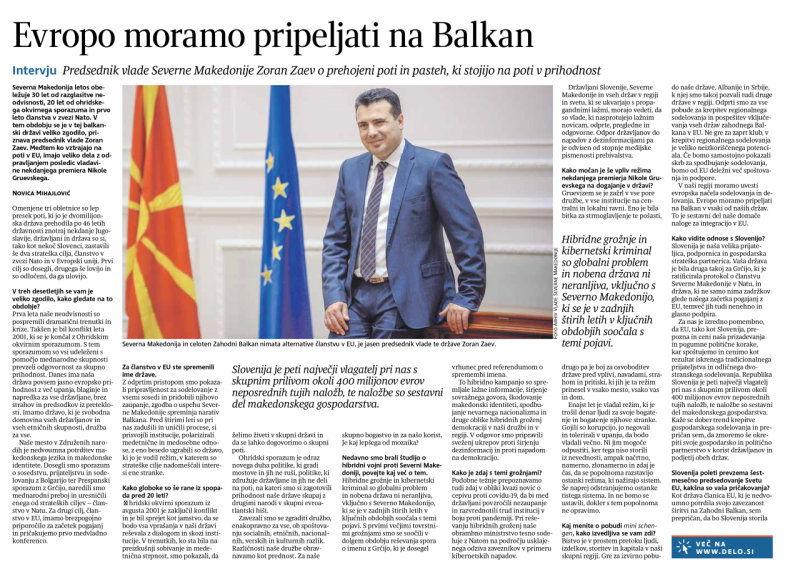 „Ако некој заслужил да добие поддршка на следниот чекор на патот кон ЕУ, тоа е Северна Македонија и важно е што Словенија, заедно со земјите од Вишеград потврдуваат дека сѐ уште има европско во Европската Унија и тоа е нашата водилка и мотивација и за реформите за да си ја европеизираме државата“, истакнува претседателот на Владата, Зоран Заев во интервјуто за електронското издание на „Дело“.