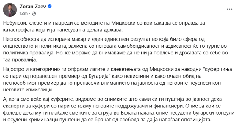 „Најостро и категорично ги отфрлам лагите и клеветењата од Мицкоски за наводни “куферчиња со пари од поранешен премиер од Бугарија” како невистини и како очаен обид на неспособниот премиер да го пренасочи вниманието на јавноста од неговите неуспеси кон неговите измислици.
