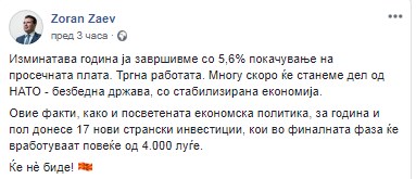 „Изминатава година ја завршивме со 5,6% покачување на просечната плата. Тргна работата. Многу скоро ќе станеме дел од НАТО – безбедна држава, со стабилизирана економија. Овие факти, како и посветената економска политика, за година и пол донесе 17 нови странски инвестиции, кои во финалната фаза ќе вработуваат повеќе од 4.000 луѓе. Ќе нѐ биде!“, напиша Заев на социјалната мрежа.