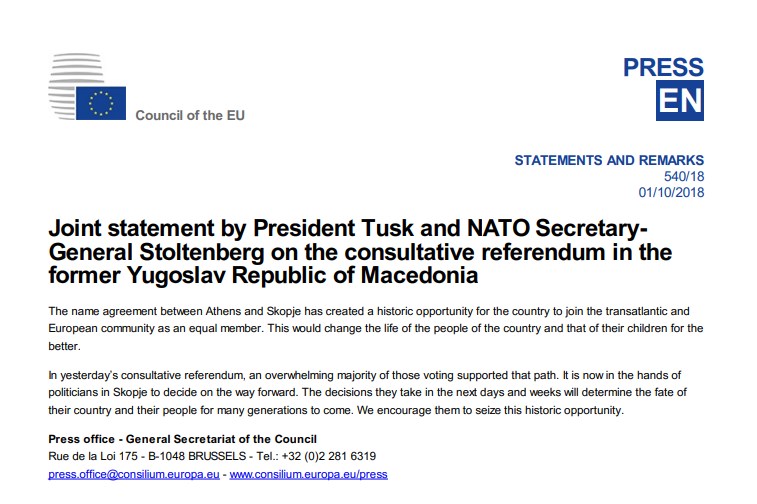 Претседателот на Европскиот совет, Доналд Туск, и генералниот секретар на НАТО, Јенс Столтенберг, објавија заедничка порака по референдумот во земјата.