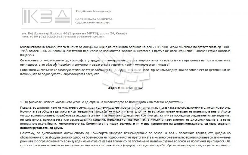 „Да појасниме, полот и политичката припадност се основи на дискриминација, а не области. Во продолжение на диспозитивот, вознемирување се утврдува во областа ‘социјална сигурност и здравствена заштита, како и правосудство и управа’. Да појасниме и ова дека во Основниот суд Скопје 1 не се даваат услуги од социјалната сигурност или здравствената заштита за да се тврди постоење на дискриминација во оваа област. Затоа, во конкретниот случај може да станува збор само за областа ‘правосудство и управа’, нешто што беше кажано и на самата седница на Комисијата“, пишува во документот.