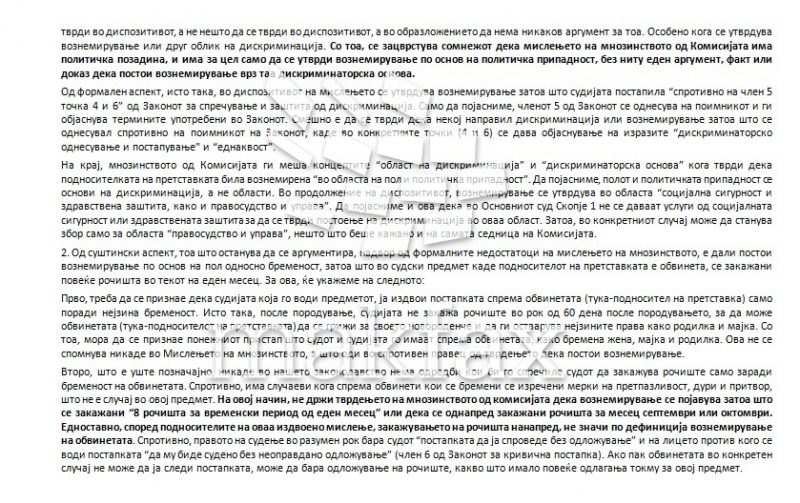 „Прво, треба да се признае дека судијата која го води предметот, ја издвои постапката спрема обвинетата само поради нејзина бременост. Исто така, после породување, судијата не закажа рочиште во рок од 60 дена после породувањето, за да може обвинетата (тука-подносителот на претставката) да се грижи за своето новороденче и да ги остварува нејзините права како родилка и мајка. Со тоа, мора да се признае понежниот пристап што судот и судијата го имаат спрема обвинетата, како бремена жена, мајка и родилка. Ова не се спомнува никаде во Мислењето на мнозинството, а што оди во спротивен правец од тврдењето дека постои вознемирување. Второ, што е уште позначајно, никаде во нашето законодавство нема одредби кои би го спречиле судот да закажува рочиште само заради бременост на обвинетата. Спротивно, има случаеви кога спрема обвинети кои се бремени се изречени мерки на претпазливост, дури и притвор, што не е случај во овој предмет“.