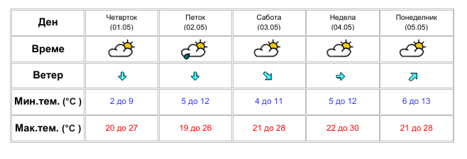 Ќе дува умерен северен ветер. Во деновите од викендот ќе биде стабилно, сончево и топло со мала до умерена облачност, а од почетокот на следната седмица се очекуваат повремени врнежи од дожд и појава на грмежи.