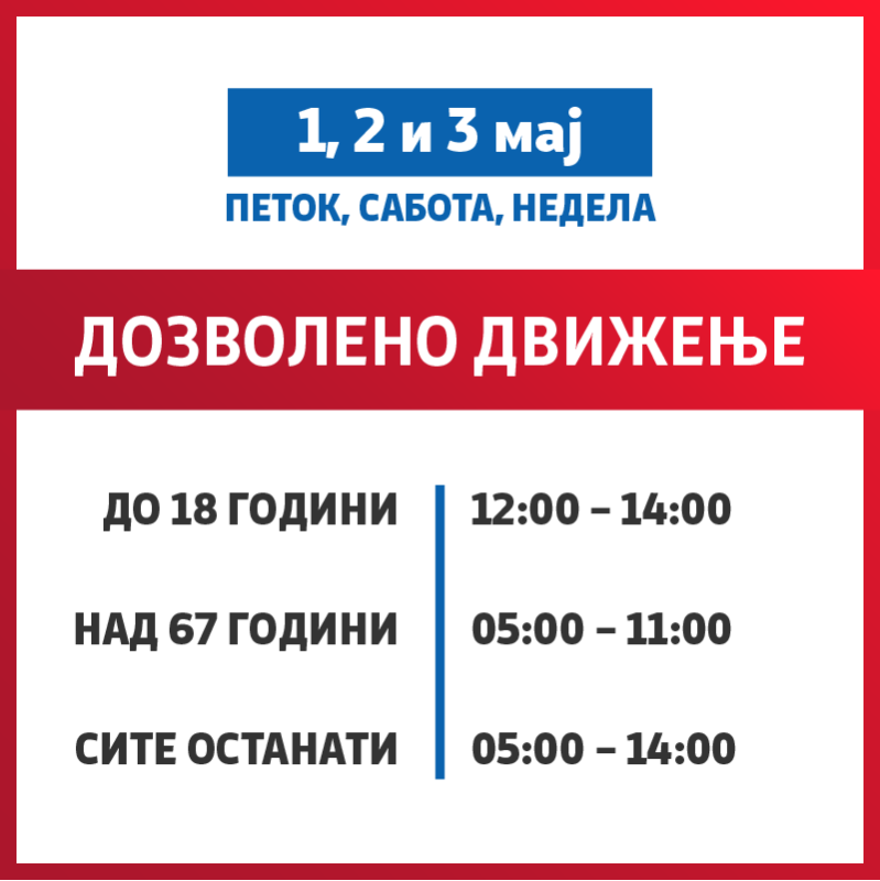 На 1, 2 и на 3 мај, односно петок, сабота и недела, ќе им биде дозволено движењето на граѓаните од 5 часот наутро до 14 часот. Забраната за движење во целата држава ќе почнува во 14 часот и ќе трае до 5 часот наутро следниот ден.