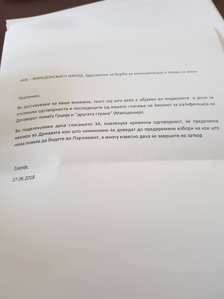 Пратениците од владејачкото мнозинство утрово добиле писмо потпишано од Здружението за борба за еманципација и права на жени на кое била прикачена и колумна од професорот Димитар Апасиев. Авторот напишал „ќе има немири, па избори и ќе одите во затвор“.