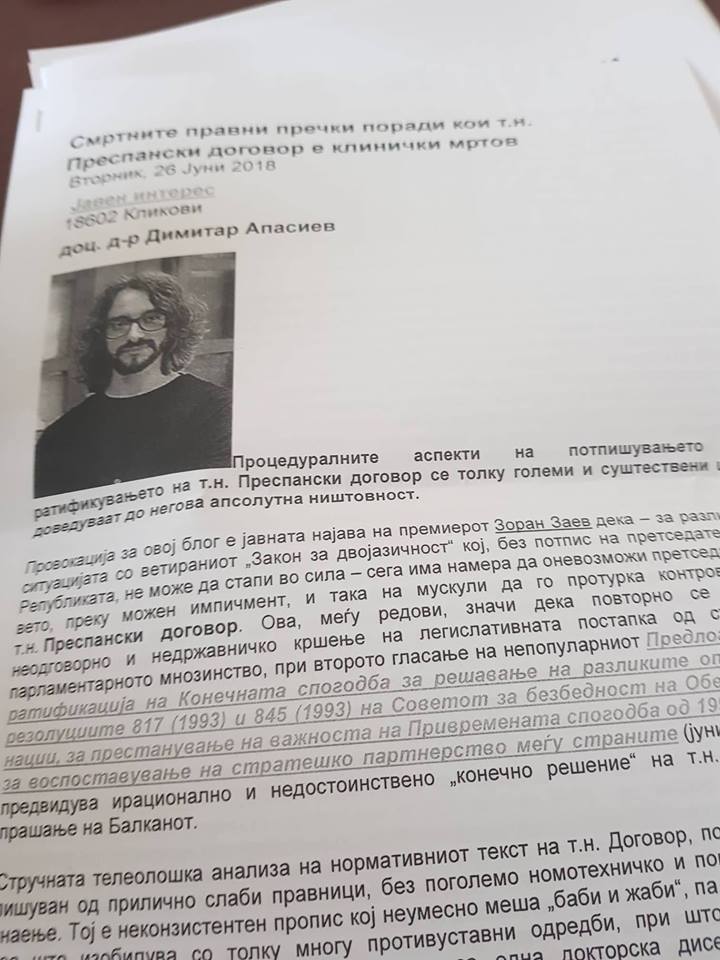 Писмото го објави пратеничката Ивана Туфегџиќ, која вели дека не е јасно што сакал писателот да постигне. Овој допис е испратен до Собранието пред повторното гласање за договорот со Грција.