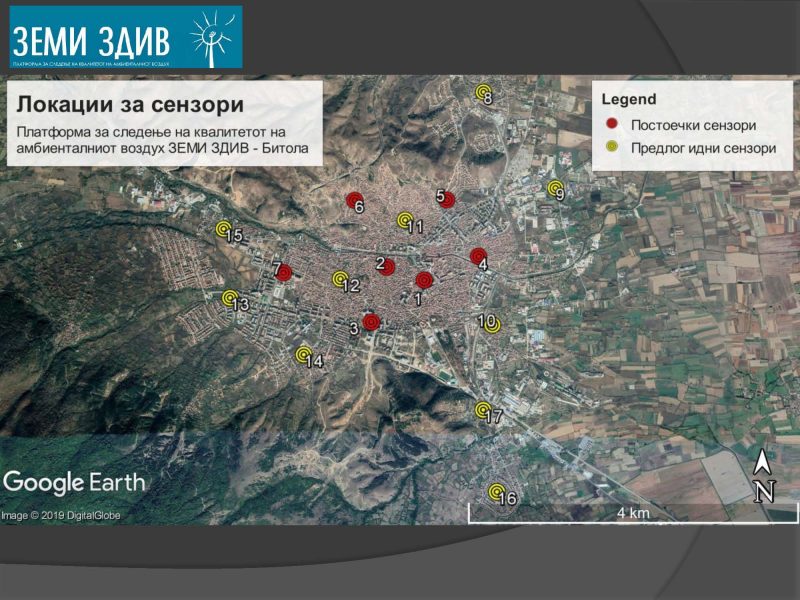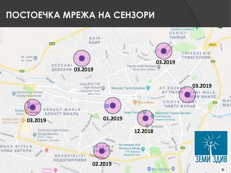 „Земи здив“ следењето на параметрите на квалитетот на амбиенталниот воздух во Битола во овој момент го врши со 7 сертифицирани мобилни мерни станици кои се набавени од независната глобална светска мрежа AIRLY и се референтни уреди што ги поседуваат сите сертификати за квалитет и стандард ISO EN 16450:2017. Сензорите на овие мерни станици мерат концентрации на ПМ 1 (единствен уред во Македонија што ја мери концентрацијата на овие честички), ПМ 2,5, ПМ 10 и од нив го генерираат нивото на CAQI. Покрај овие параметри, тие ја мерат и температурата, како и воздушниот притисок и влажностa на воздухот, а податоците се графички презентирани на веб-платформата на AIRLY, на која може да се пристапи од секој паметен уред. Податоците се прикажуваат во реално време, а вредностите се ажурираат на секои 3 минути. Нашата заложба е инсталирање дополнителни 13 сензори, кои со постојните 7 ќе генерираат точни интерполирани мерења и податоци за секој дел од Битола.