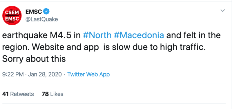 Земјотрес со јачина од 4,5 степени вечерва беше почувствуван во земјата и регионот. Епицентарот, како што јавуваат медиумите од регионот, е во Албанија, а во 21.17 часот тресењето било почувствувано и во делови од нашата земја, како и во Црна Гора, со јачина од 4,6 степени според Рихтеровата скала.