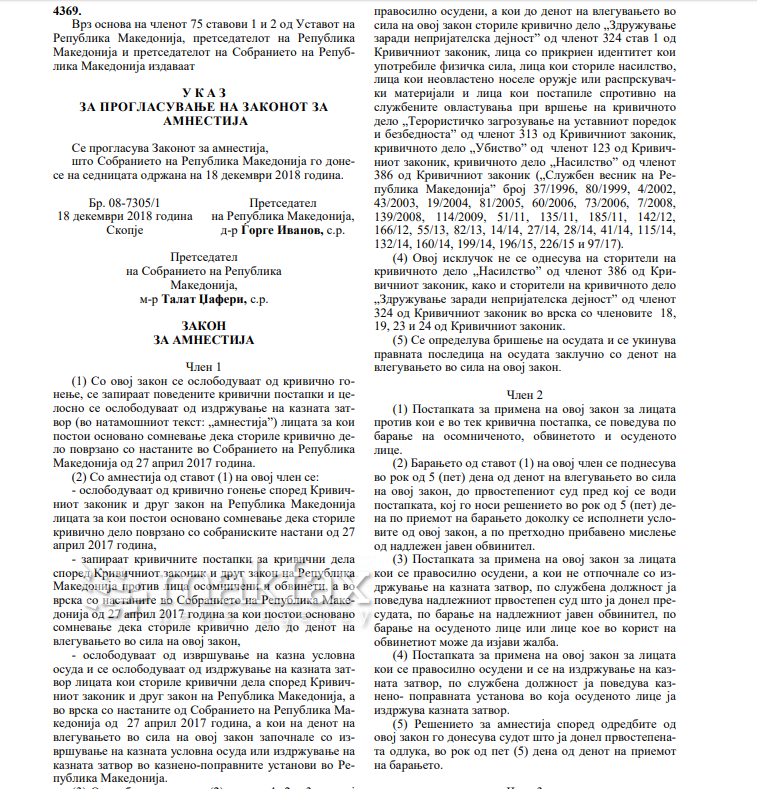 Законот за амнестијата, кој на 18 овој месец беше донесен со 95 гласа „за“, ниту еден „против“ и ниту еден „воздржан“, е веќе потпишан од страна на претседателот Ѓорге Иванов и вчера е објавен во „Службен весник“, со што стапи во сила.