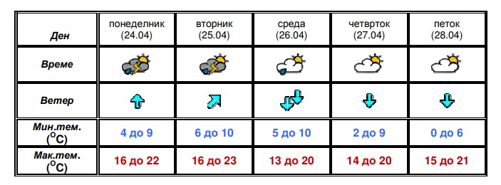 Времето утре ќе биде променливо облачно со сончеви периоди. Ќе дува слаб до умерен ветер од северен правец. Минималната температура ќе биде во интервал од 5 до 8, а максималната ќе достигне од 12 до 17 степени.
