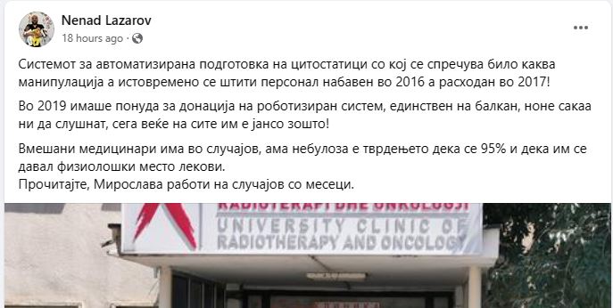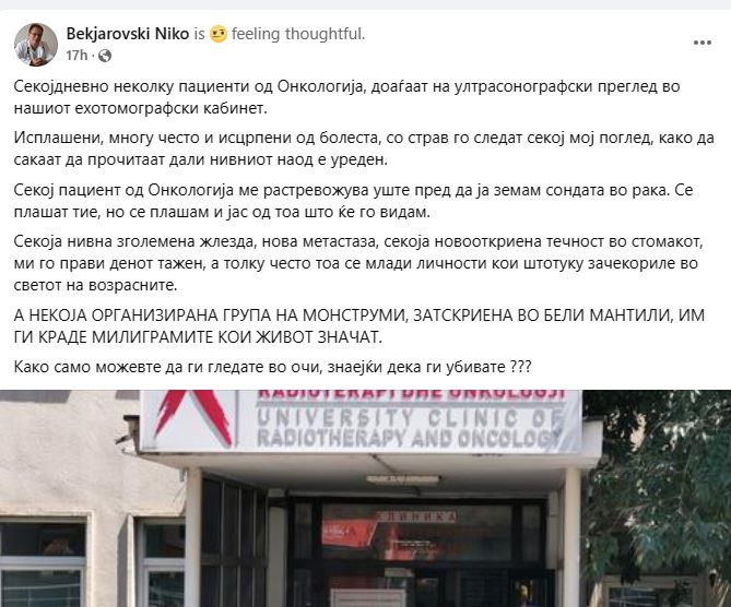 Поради случувањата на Клиниката за онкологија по објавите на неделникот „Фокус“ дека на пациентите им биле давани физиолошки раствори, а скапите лекови против канцерогените заболувања завршувале на црниот пазар, на социјалните мрежи со свој став излегоа доктори згрозени од целиот случај.
