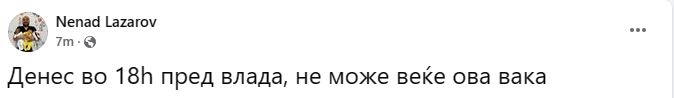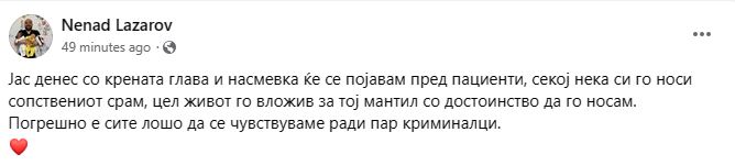 „Јас денес со крената глава и насмевка ќе се појавам пред пациентите, секој нека си го носи сопствениот срам, цел живот го вложив за тој мантил со достоинство да го носам“, напиша Ненад Лазаров и порача дека денеска ќе се појави на протестот пред Владата.