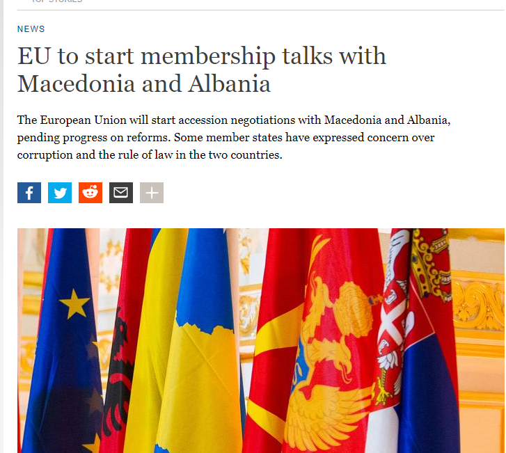 Германската „Дојче веле“ објави дека ЕУ ќе почне преговори за членство со Македонија и Албанија, а потоа пишува дека дел од земјите членки изразиле загриженост поради корупцијата и владеењето на правото во двете земји.