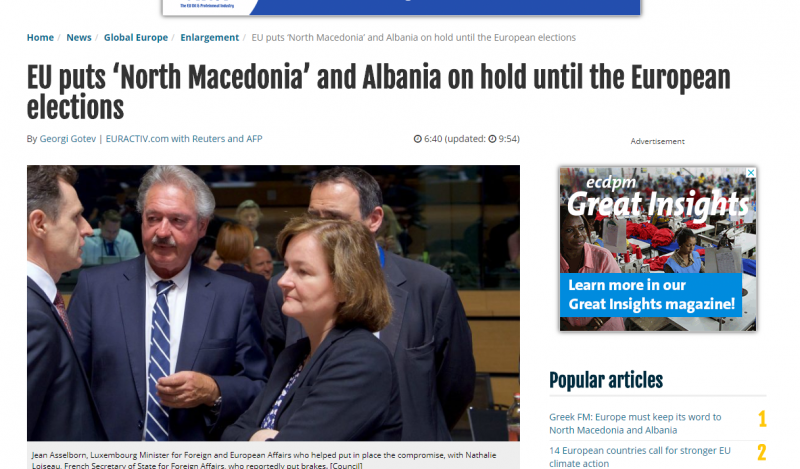 „ЕУ обсервер“ објави наслов „ЕУ ги одложи разговорите за Македонија и Албанија“, додека „Еурактив“ исто така објави дека „ЕУ ги стави ‘Северна Македонија’ и Албанија на чекање до изборите во Европската Унија“.