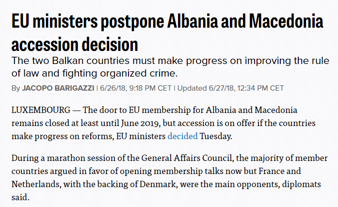 „Вратата за членство во ЕУ за Албанија и Македонија останува затворена барем до јуни 2019 година, но приемот е на понуда доколку земјите покажат прогрес во реформите“, известува медиумот. Тие пишуваат дека јазикот во декларацијата им дозволува на проевропските влади во Македонија и Албанија да им кажат на своите граѓани дека вратата до евентуално членство во ЕУ е отворена. „Но на Франција и Холандија, кои се внимателни во ширењето на ЕУ кон нови земји, им дозволува да соопштат дека не е донесена никаква финална одлука“, се вели во текстот.
