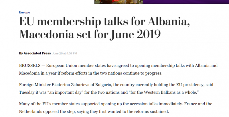 Американскиот „Вашингтон пост“, кој пренесува вест од агенцијата „Асошиејтед прес“, објави наслов „Преговорите за членство во ЕУ за Албанија, Македонија закажани за јуни 2019 година“. Понатаму во текстот се вели дека Европската Унија се согласила да отвори разговори за членство во Унијата со Албанија и Македонија за една година доколку реформите во двете земји продолжат да се развиваат.