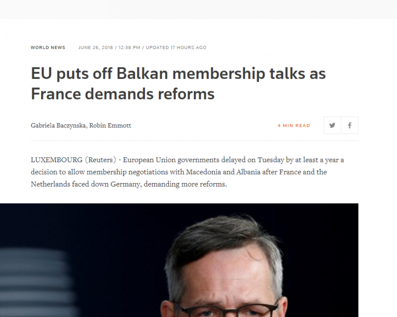 „Ројтерс“ известува дека „ЕУ ги одложила разговорите за балканско членство откако Франција бара реформи“. „Владите на Европската Унија во вторникот ја одложија одлуката за најмалку една година за дали да се дозволат преговори за членство со Македонија и Албанија откако Франција и Холандија не се согласија со Германија и бараа повеќе реформи. Неочекуваниот резултат и покрај широката поддршка во ЕУ, ја покажа одлучноста на францускиот претседател Емануел Макрон да ја одложи одлуката по изборите на Европскиот парламент во мај, поради стравот од антиимигрантско расположение, велат дипломатите“, пишува медиумот.