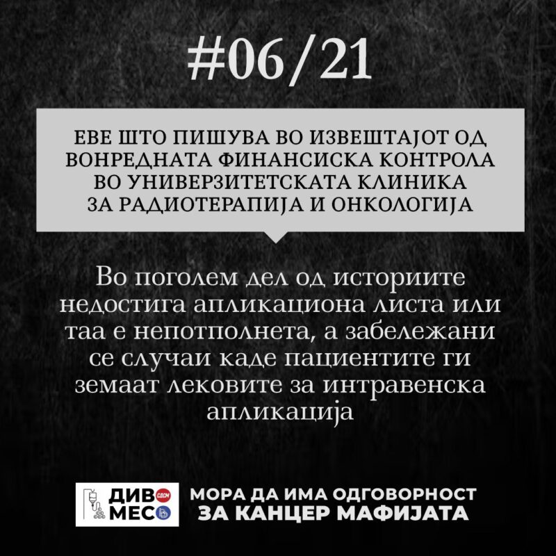 „Според податоците од извештајот, во поголем дел од историите недостига апликационата листа или таа не нецелосно пополнета. Исто така забележани се случаи каде што на пациенти им биле давани лекови на рака да ги аплицираат во други здравствени установи, а биле книжени како аплицирани на клиниката на Онкологија.