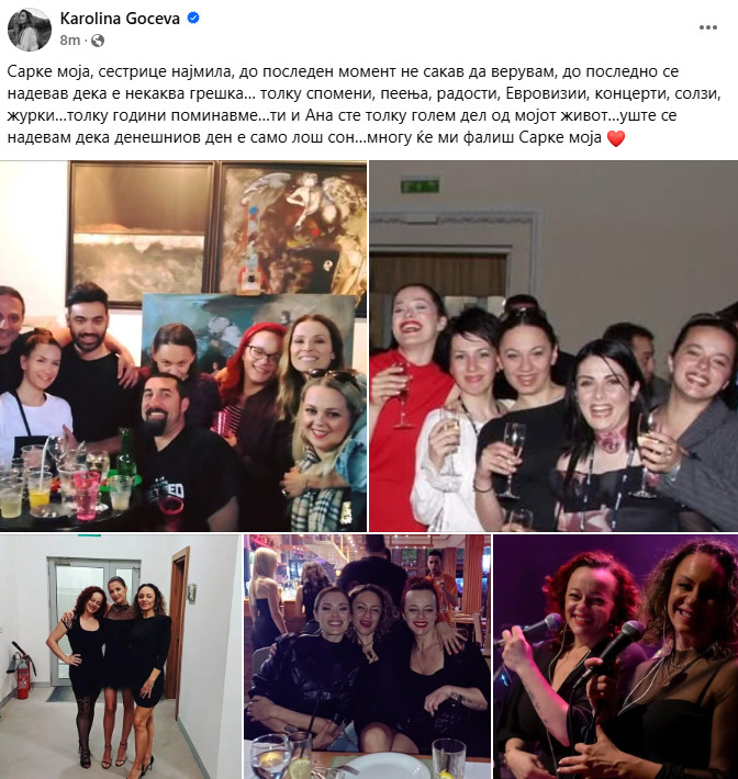 „Сарке моја, сестрице најмила, до последен момент не сакав да верувам, до последно се надевав дека е некаква грешка… толку спомени, пеења, радости, Евровизии, концерти, солзи, журки…толку години поминавме…ти и Ана сте толку голем дел од мојот живот…“, напиша Каролина Гочева на социјалните мрежи.