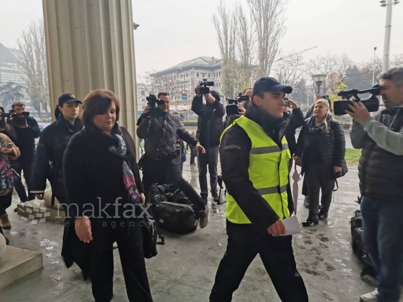 Ексшефицата на СЈО Катица Јанева утрово се симна од полициското комбе и во придружба на полицајци влезе во судот, каде што ја пречекаа бројни новинарски екипи.
