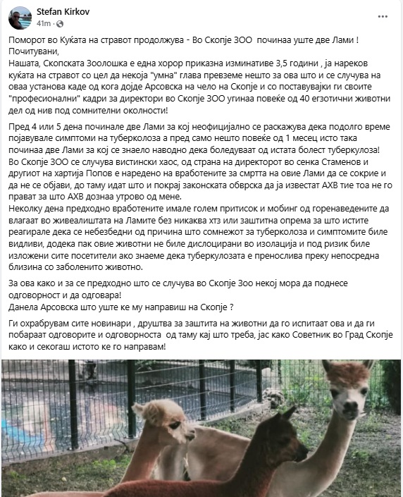 „Нашата, скопската Зоолошка, е една хорор-приказна изминативе 3,5 години, ја нареков куќата на стравот со цел некоја ‘умна’ глава преземе нешто за ова што ѝ се случува на оваа установа, во која од кога дојде Арсовска на чело на Скопје и поставувајќи ги своите ‘професионални’ кадри за директори, во Скопје ЗОО пцовисаа повеќе од 40 егзотични животни, некои од нив под сомнителни околности!“, напиша советникот во Советот на Град Скопје од ВМРО-ДПМНЕ, Стефан Кирков, на социјалните мрежи.